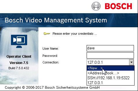 After entering a properly formatted address, enter a valid user name and password. SSH users MUST have a password associated with their BVMS account. User accounts without a password cannot log in utilizing an SSH Connection. |