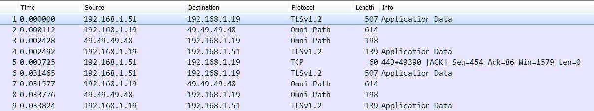 After connection is established via an SSH Tunnel, all communications between the BVMS Server (192.168.1.19) and a remote client (49.49.49.48) are encrypted. Below is a Wireshark Capture taken from the BVMS Server after a connection is established.