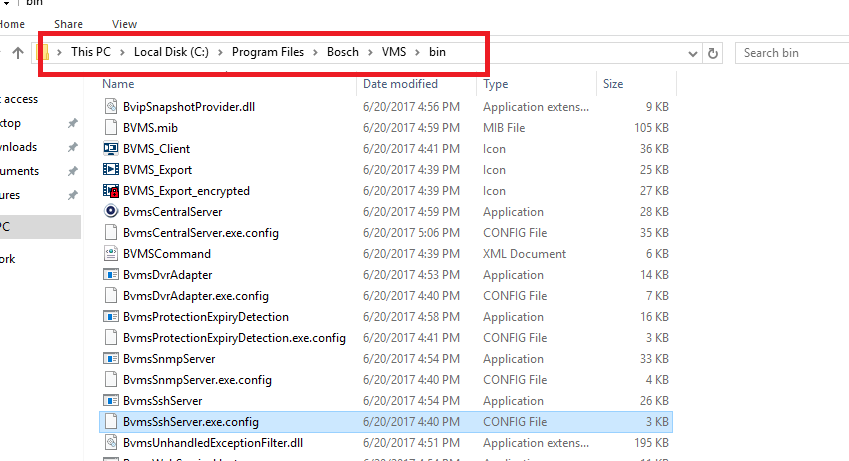 Locate the SSH service configuration file in "C:\Program Files\Bosch\BVMS\bin"