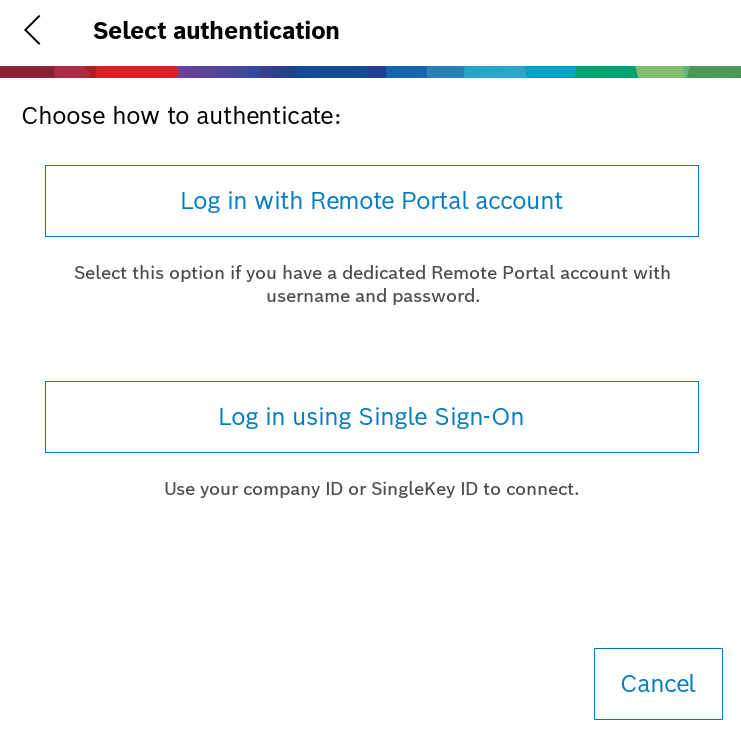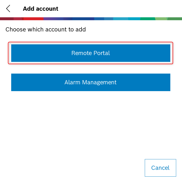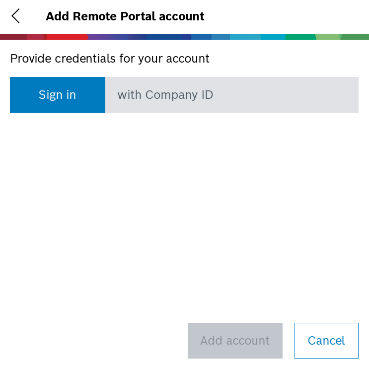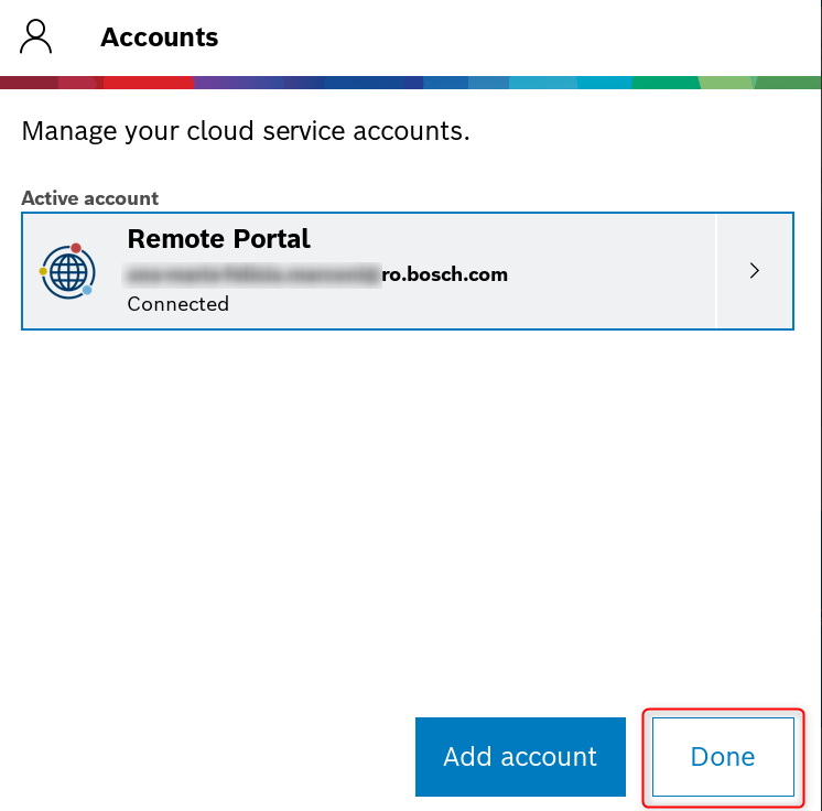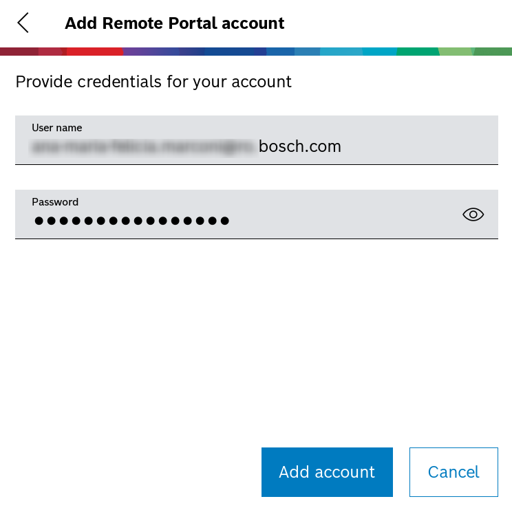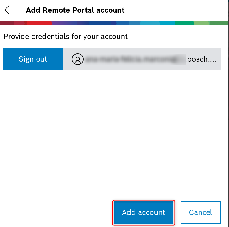 - If you select the first option Log in with Remote Portal account, you have to add your Remote Portal Account credentials and hit Add account button