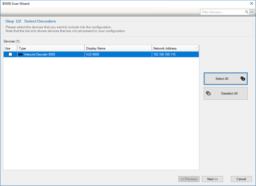 Add a decoder by Scan: for scanning right click on the node "Decoders" > select "Scan for Decoders" > select the VIDEOJET DECODER 7xxx/ 8xxx from Devices window and click next