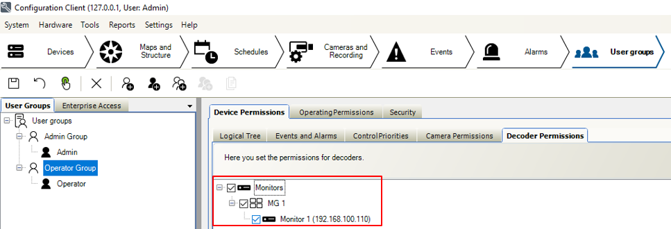 Verify or set the decoder permission settings in the User groups to define which group is authorized to use the Monitor Group: