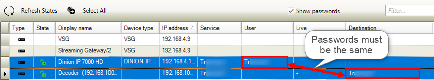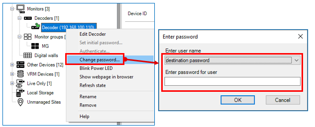 Enter the "user" authorization password of the cameras as the "Destination password" of the decoder
