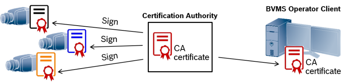 When using a CA signed certificate an effort of creating such a certificate for each camera is higher. This however provides a higher security and only 1 CA certificate has to be distributed on each BVMS Operator Client. Nevertheless executed manually for each single large system component this method also consumes an inacceptable amount of time.