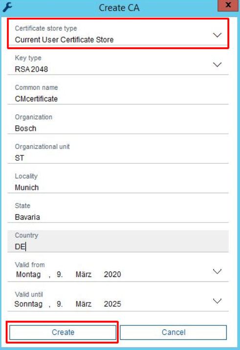 3. Select Current User Certificate Store as Certificate store type, enter the rest of the data in the dialog and press Create button: