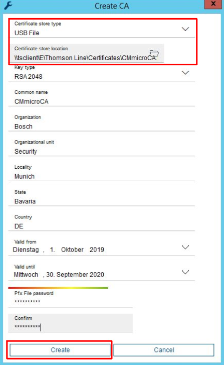 Select USB File as Certificate store type and location in the encrypted USB stick as Certificate store location, enter the rest of the data in the dialog and press Create button: