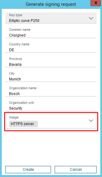 4. In the signing request generation mask enter the credentials, choose HTTPS server as usage and press Create button. If nothing is entered as a Common name, the certificate’s name will be its camera’s IP address. Please be also aware of restrictions described in the chapter 3. Restrictions