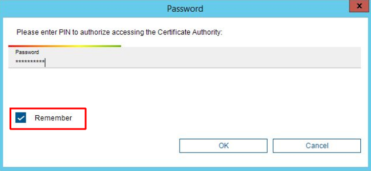 In case a CA certificate from USB stick is used, CM will prompt to enter the password of the certificate file that was configured in the chapter1.2.2 MicroCA certificate on USB stick, step 4. Select the check box Remember so that CM can use the password for signing the certificates of all the selected cameras. Otherwise CM will ask for a password for every camera separately. Press OK button to continue.