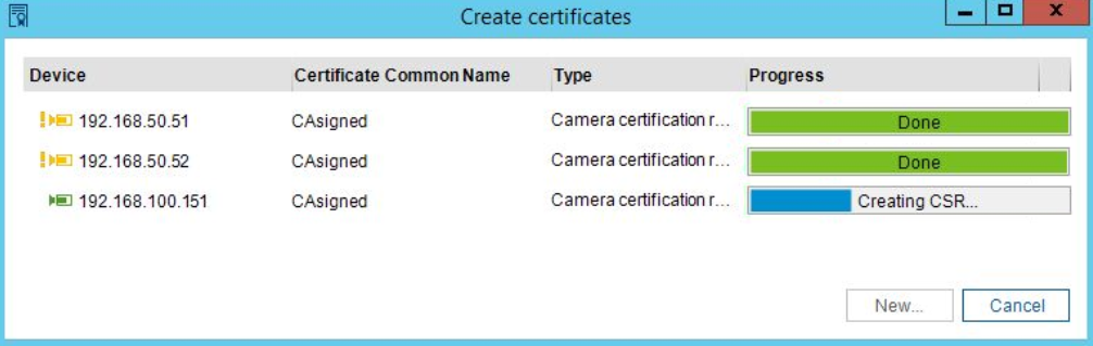6. CM requests certificate signing requests from the cameras, signs them with CA certificate from its configuration and uploads the signed certificates back to the cameras. Operation status is shown in the progress bar for every camera separately. Please be aware that older cameras may take some minutes in order to generate a signing request.