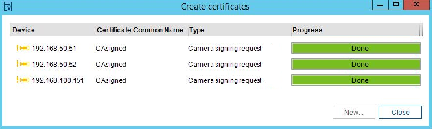 CM requests certificate signing requests from the cameras, signs them with CA certificate from its configuration and uploads the signed certificates back to the cameras. Operation status is shown in the progress bar for every camera separately. Please be aware that older cameras may take some minutes in order to generate a signing request.