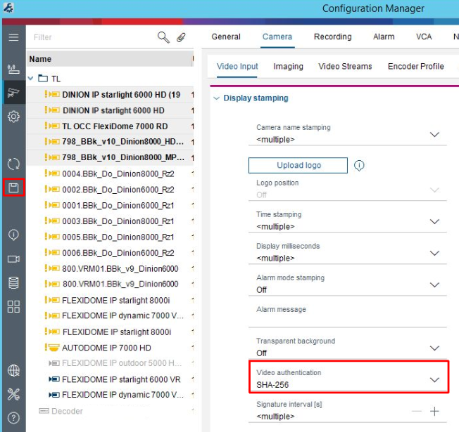 For video authentication feature in BVMS an authentication method has to be configured in the camera. The setting can be changed in CM under Camera/Video Input while multiple cameras are selected. SHA-256 method is recommended. Once configured press save button.