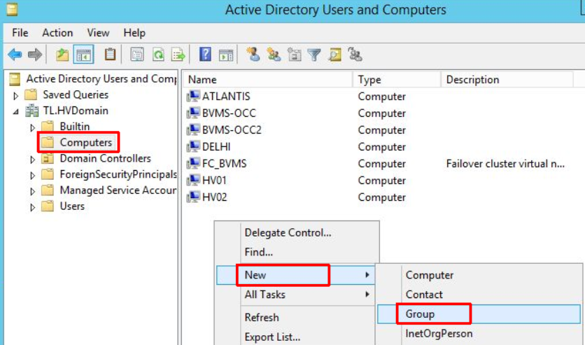 In the Active Directory Users and Computers navigate to Computers on the left side. On the right side right click and select New / Group: