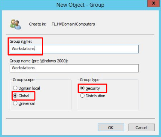 Enter the group name and select group scope Global and group type Security. Click OK.