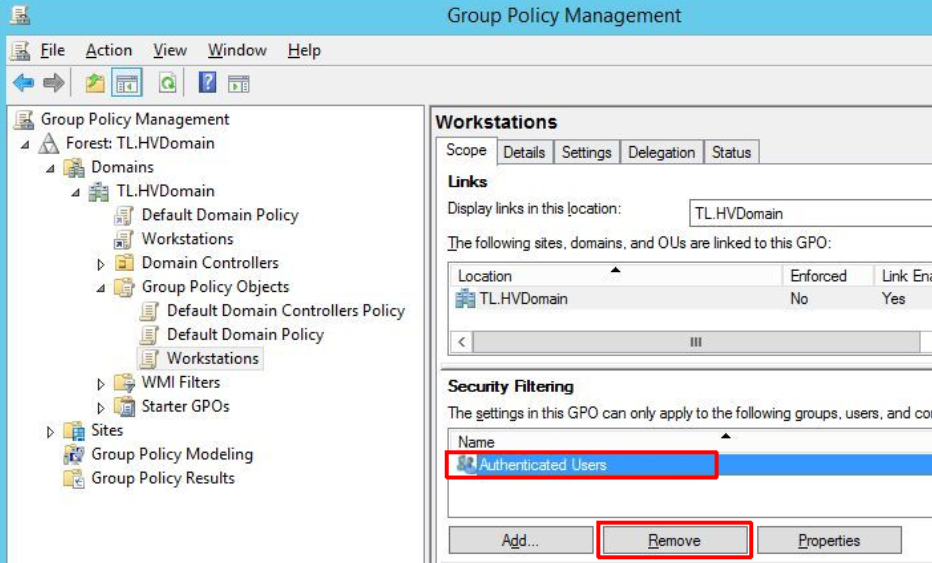 4. Click on the new created group policy, select Authenticated Users on the right side and press Remove button. This is because certificates should be applied only on the workstations and not on all the members of domain.