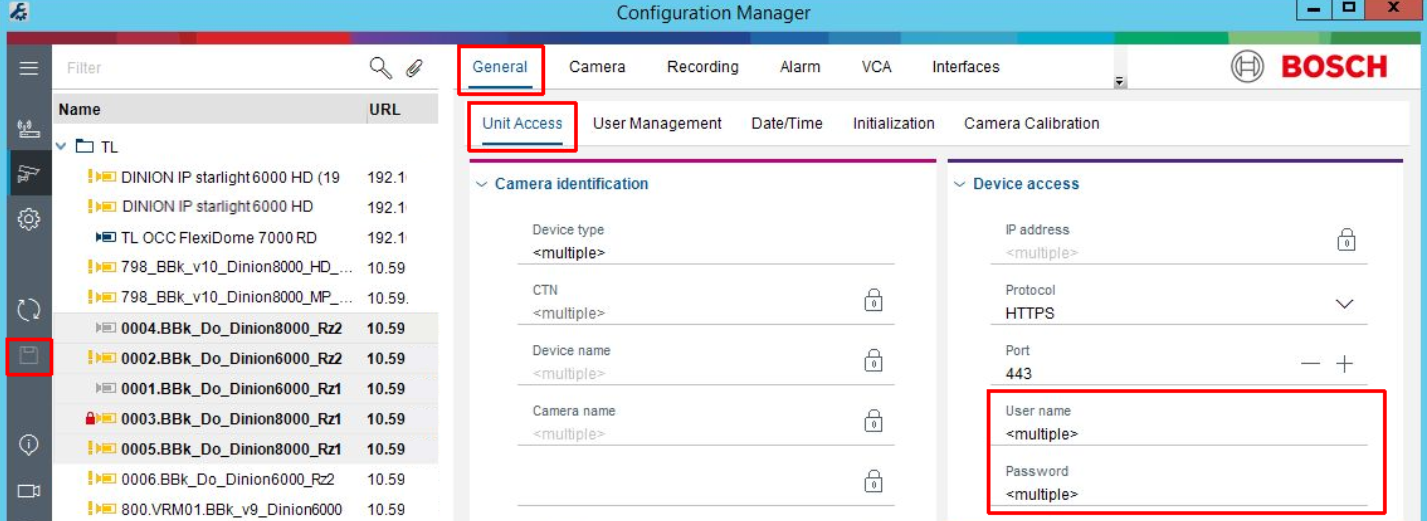 In case cameras are protected with passwords, it makes sense to save their pass words in CM configuration. For that reason cameras first should be added to CM My Devices tab by right clicking them and choosing Add to System. If multiple cameras have the same password, choose multiple cameras in My Devices tab and enter the service password on the right side under General / Unit Access. Press save button.