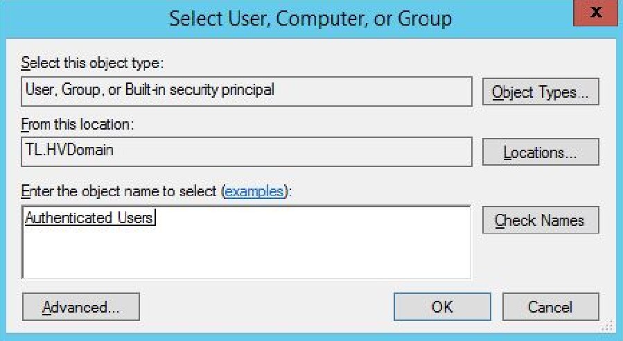 7. Enter the Authenticated Users and press OK. In the next dialog the permissions should be Read. Press OK.