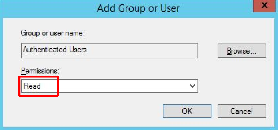 Enter the Authenticated Users and press OK. In the next dialog the permissions should be Read. Press OK.