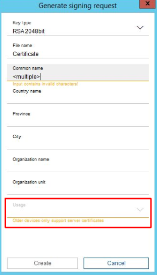 In case multiple HTTPS server capable and 1 incapable device are selected, the usage selection is disabled for all of them. Therefore it is recommended to create certificates separately for these 2 groups in order to avoid additional steps. Nevertheless, older device certificates created without