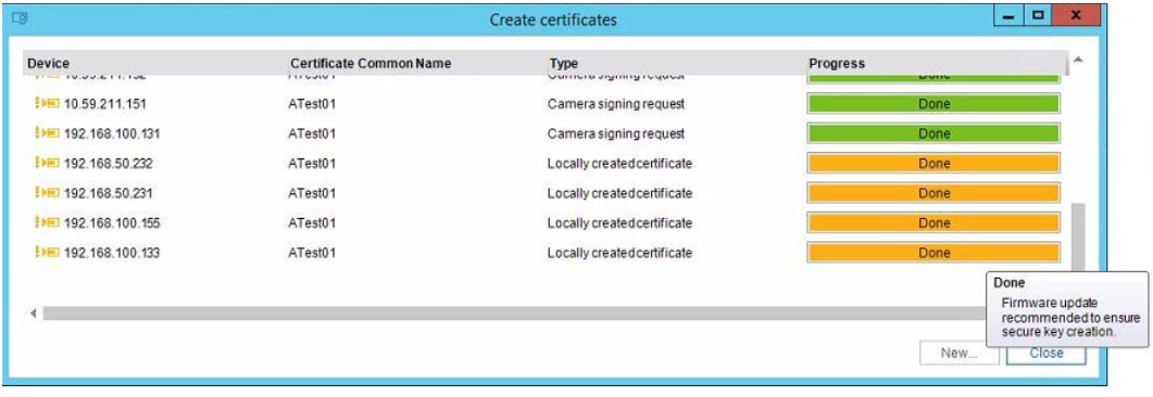 keys are created directly on the CM computer and uploaded to the camera over secured connection. Since handling of private key s on the local computer is considered to be not the safest way, the certificate type is indicated as “Locally created certificate” and the progress bar is colored yellow instead of green. A tool tip, when hovering with a mouse over the progress bar, advices to upgrade the firmware for more safety.