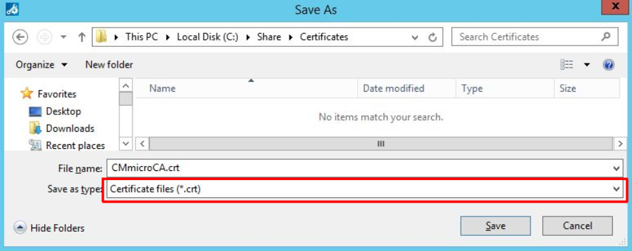 The DC certificate is available in Local Machine Certificate Store. The CM MicroCA certificate can be saved in the Current User Certificate Store. In both cases certificates with their private keys are available directly on the computer and CM has to be installed on the same machine in order to use them. Saving a private key directly on the computer t hat is constantly online introduces a risk as this key might be extracted by an unauthorized person who manages to access the network. Therefore it is recommended to use the CA certificate from a Windows Certificate Store only if computer can be put offline once the certificate creation is completed. In case it is not possible, please make sure that the network is properly secured.