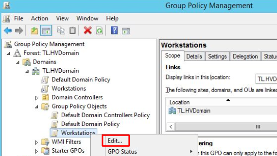 Go to Group Policy Management like described in the chapter "Configure a domain policy for workstations group", right click the Workstations Group Policy Object created in the chapter "Create AD computer group for BVMS Operator Client workstations" and select Edit:
