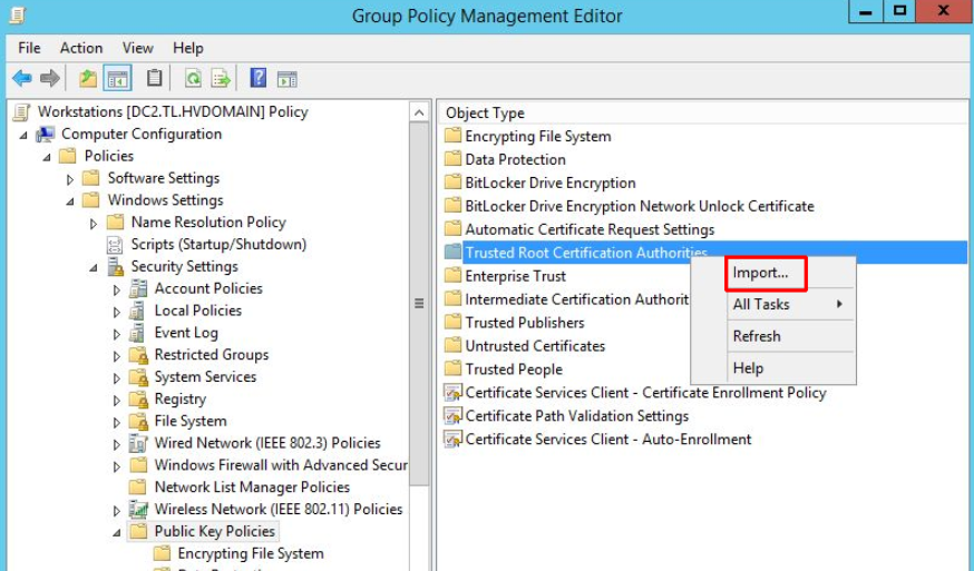 4. In the newly opened window on the left side navigate to Policies / Windows Settings / Security Settings / Public Key Policies, right click on the Trusted Root Certification Authorities on the right side and select Import: