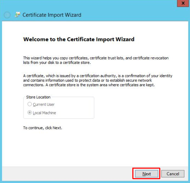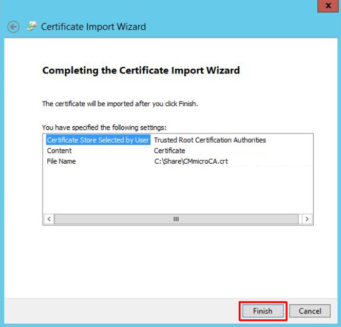 Leave the default store to import the certificate – Trusted Root Certification Authorities – and click Next: