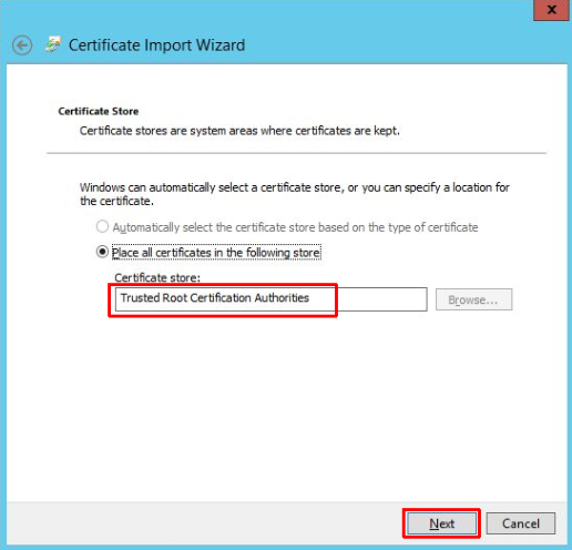 7. Leave the default store to import the certificate – Trusted Root Certification Authorities – and click Next: