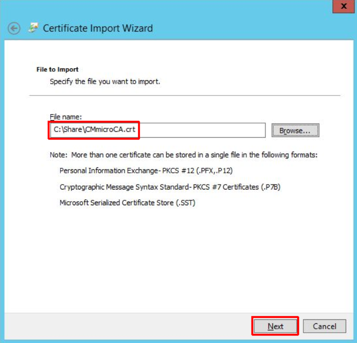 5. In the Certificate Import Wizard leave the default settings and click Next: