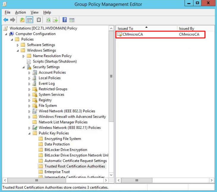 9. Once certificate was successfully imported it appears in the Group Policy Management Editor under Policies / Windows Settings / Security Settings / Public Key Policies / Trusted Root Certification Authorities: