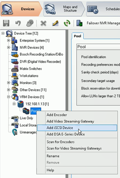 - Open Configuration Client > Devices tab > right click on the Pool > select Add iSCSI Device