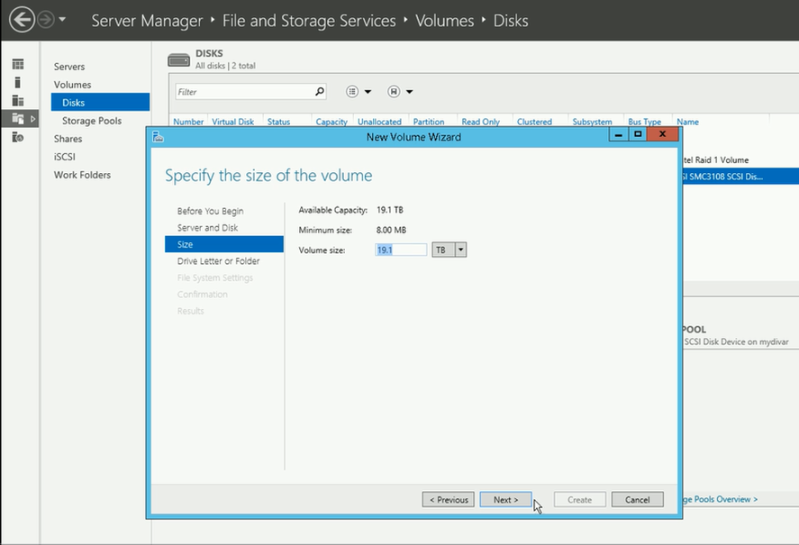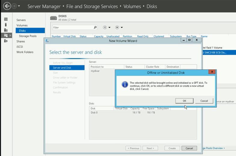 - Right click on it > New Volume > Next > Next > OK to initiate the creation of the new RAID 5 partition as GPT allocating 19.1 Tb of unallocated capacity