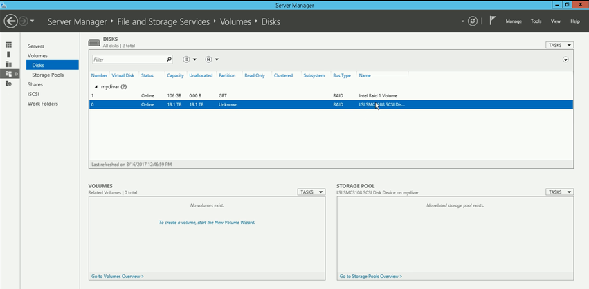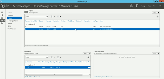 Open Server Manager > File and storage Services > Volumes > Disks