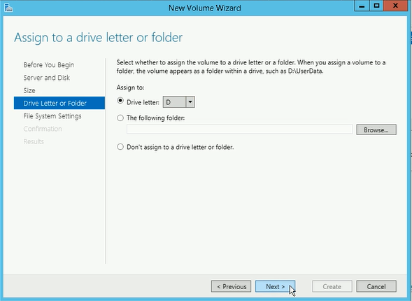 - Assign to the volume a drive letter (the default one should be D) and click Next