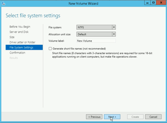 - File System Settings: We recommend you to select “NTFS” for File system and “Default” for Allocation unit size and click Next
