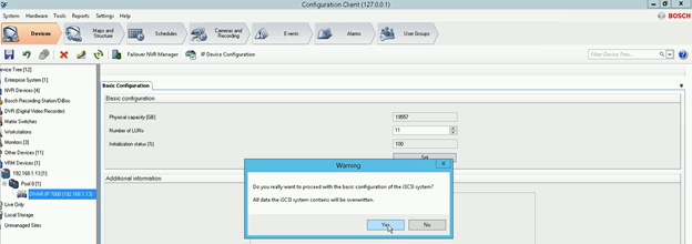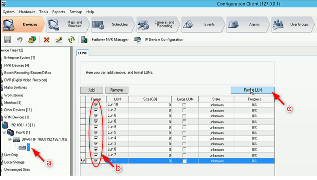 - Under DIVAR IP 7000 will be displayed a new icon. a) Click on it > b) tick all the boxes next to the LUNs > c) Hit Format LUN button > OK