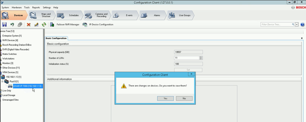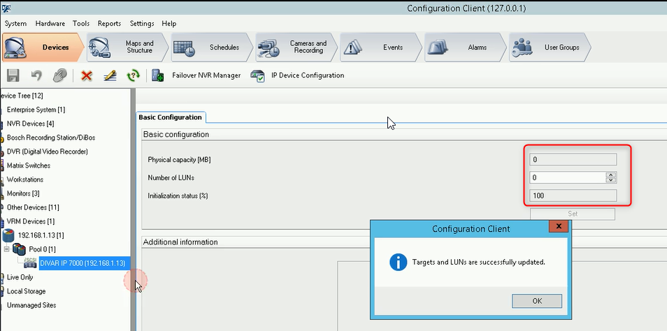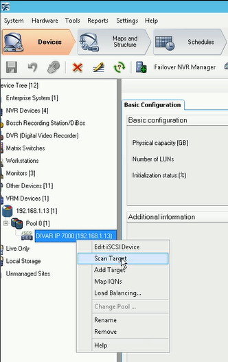 - Right click on your device in Configuration Client > Scan Target > “Target and LUNs are successfully updated” is displayed but physical capacity is not detected.