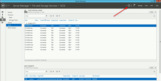 In meanwhile, go to Server Manager > iSCSI and click on the refresh button. All iSCSI virtual disks will be visible here (11 in total, as we set earlier)
