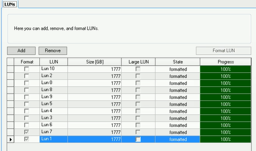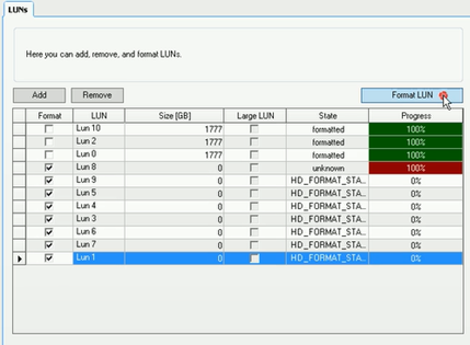 If some of the LUNs were not formatted, tick all the remaining boxes with status “unknown” or “HD_FORMAT….” and hit again the Format LUN button