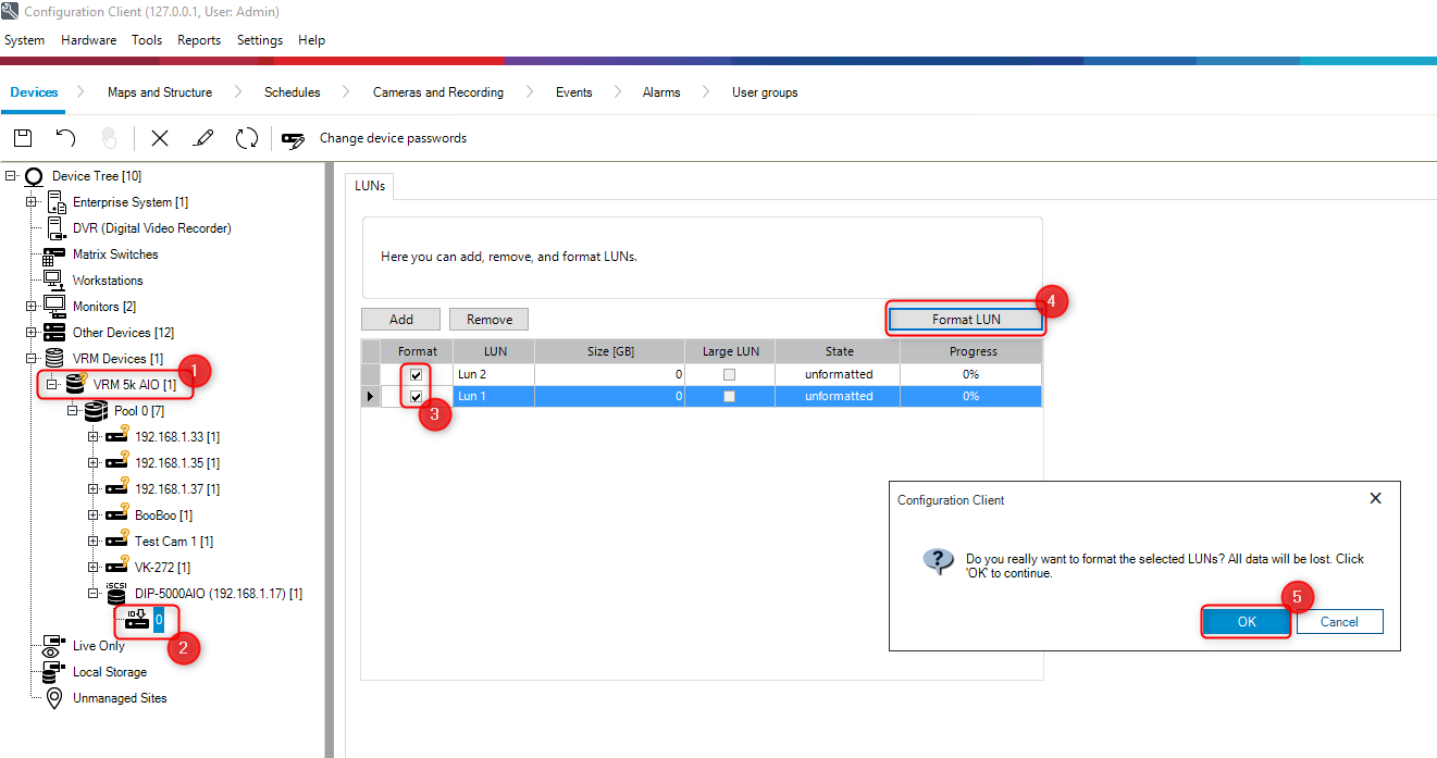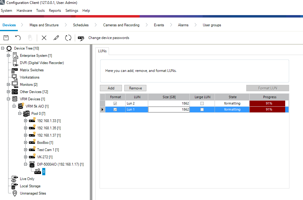 5. Add the storage to the VRM system and format the LUNs