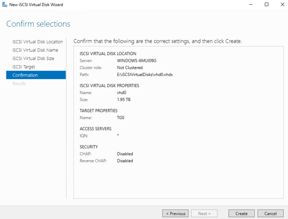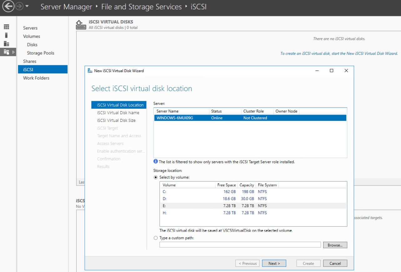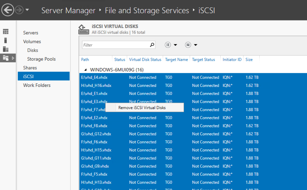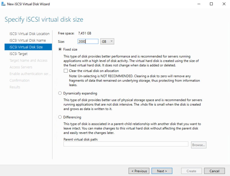 4. Go back to the Server Manager and create multiple virtual disk files with a fixed file size of maximum 2000GB.