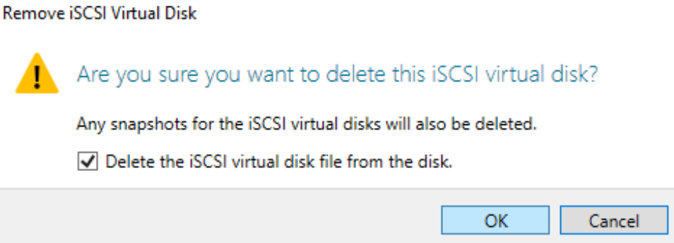 Note: make sure to select “Delete the iSCSI virtual disk file from the disk”