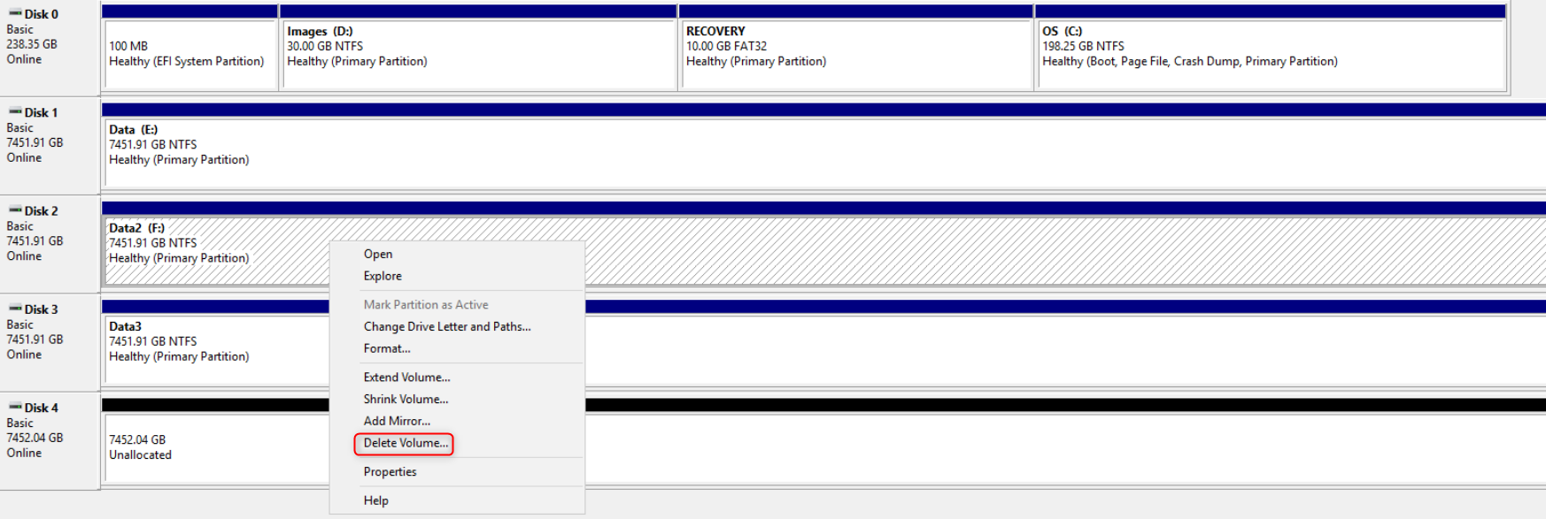 2. Delete data volumes on the drives that will act as mirror targets (Data2 and Data4 in this case):