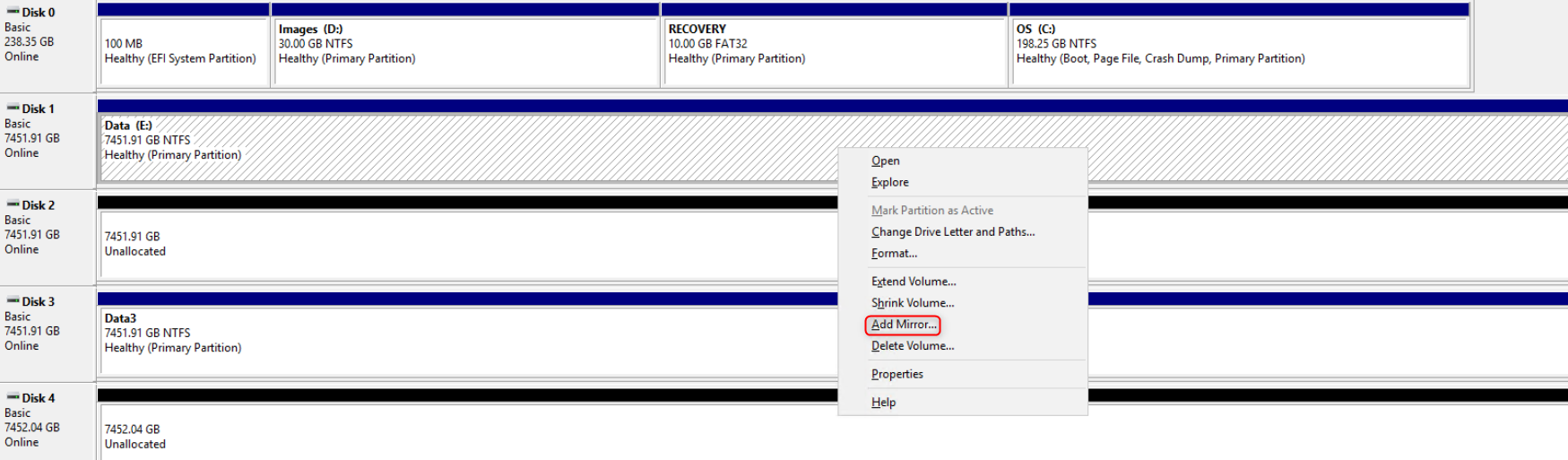- Apply the same steps to Disk 4 as a mirror drive for the Data3 partition