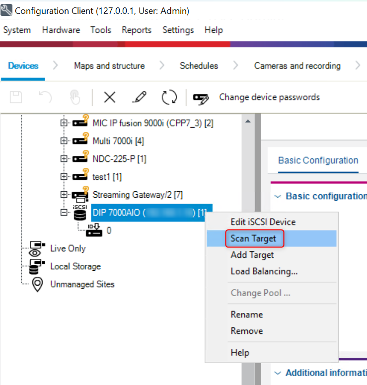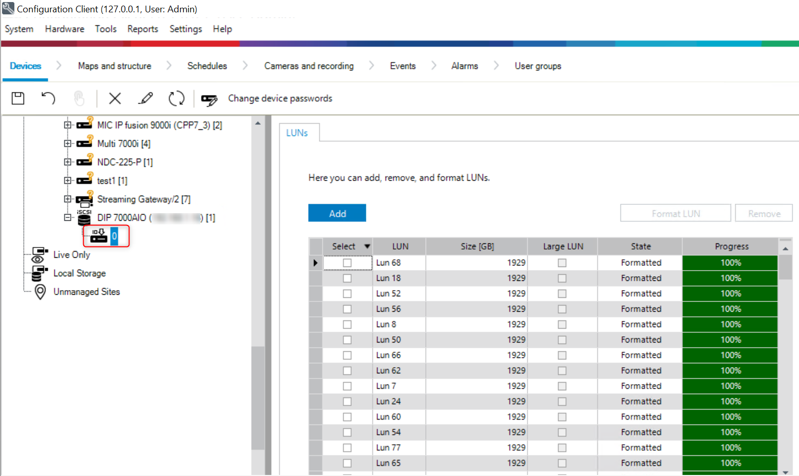 Go to Configuration Client and right click on the DIP 7000 AIO > select Scan Target and check if the LUNs are formatted.