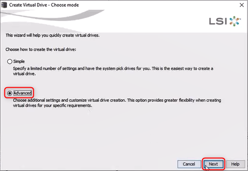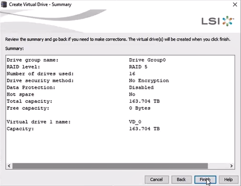 15. Check the settings for the virtual drive configuration.
