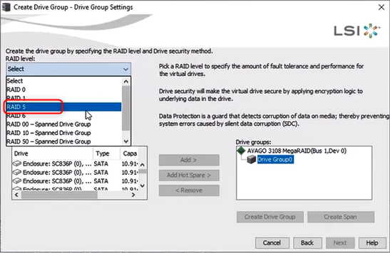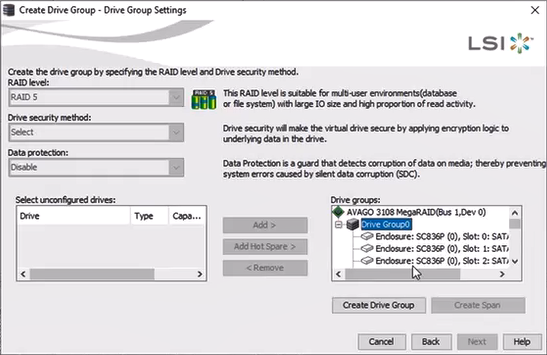 Hint: If you want to select all the drives at one time you can select 1 drive from the list, then press "ctrl+A" and then click Add> to move all the drives in the Drive groups list and afterwards click on the "Create Drive Group" button