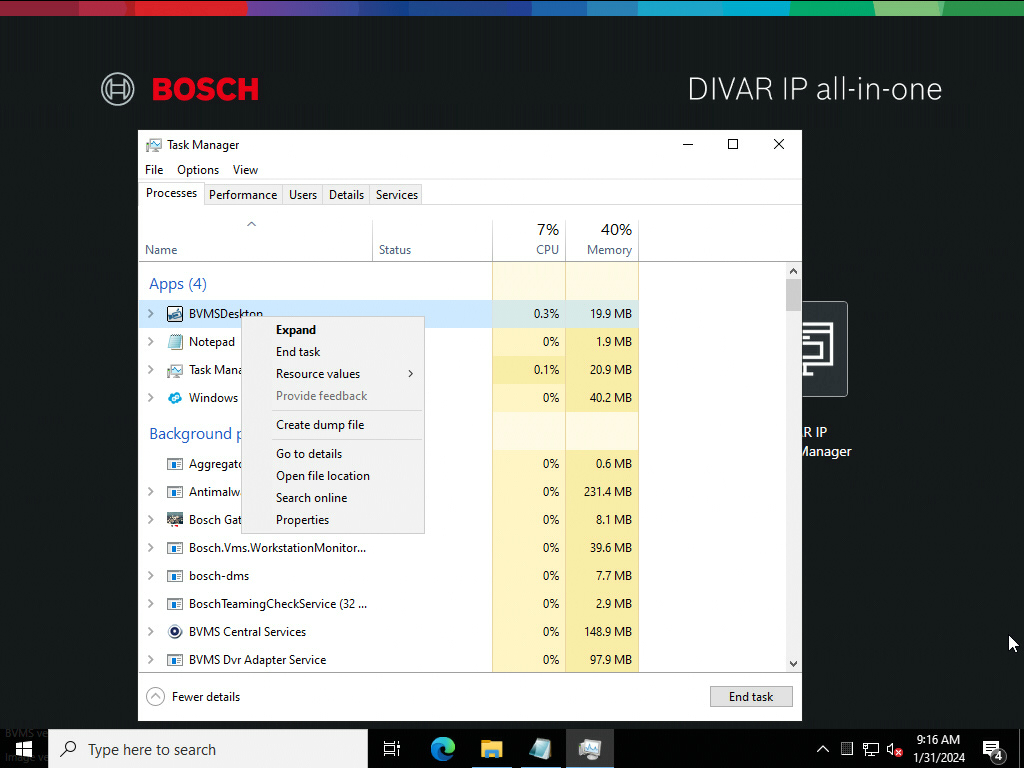 5.2.3. Right click over the BVMSDesktop Process to open context menu