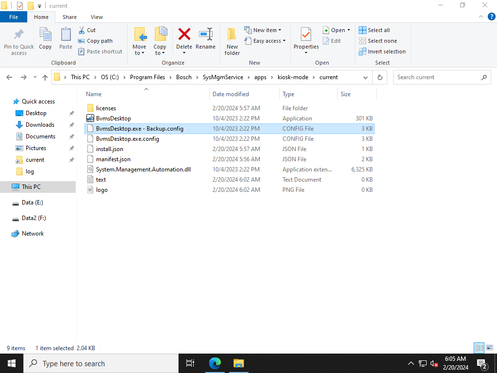 3. Backup the current Kiosk Mode Configuration file BvmsDesktop.exe.config