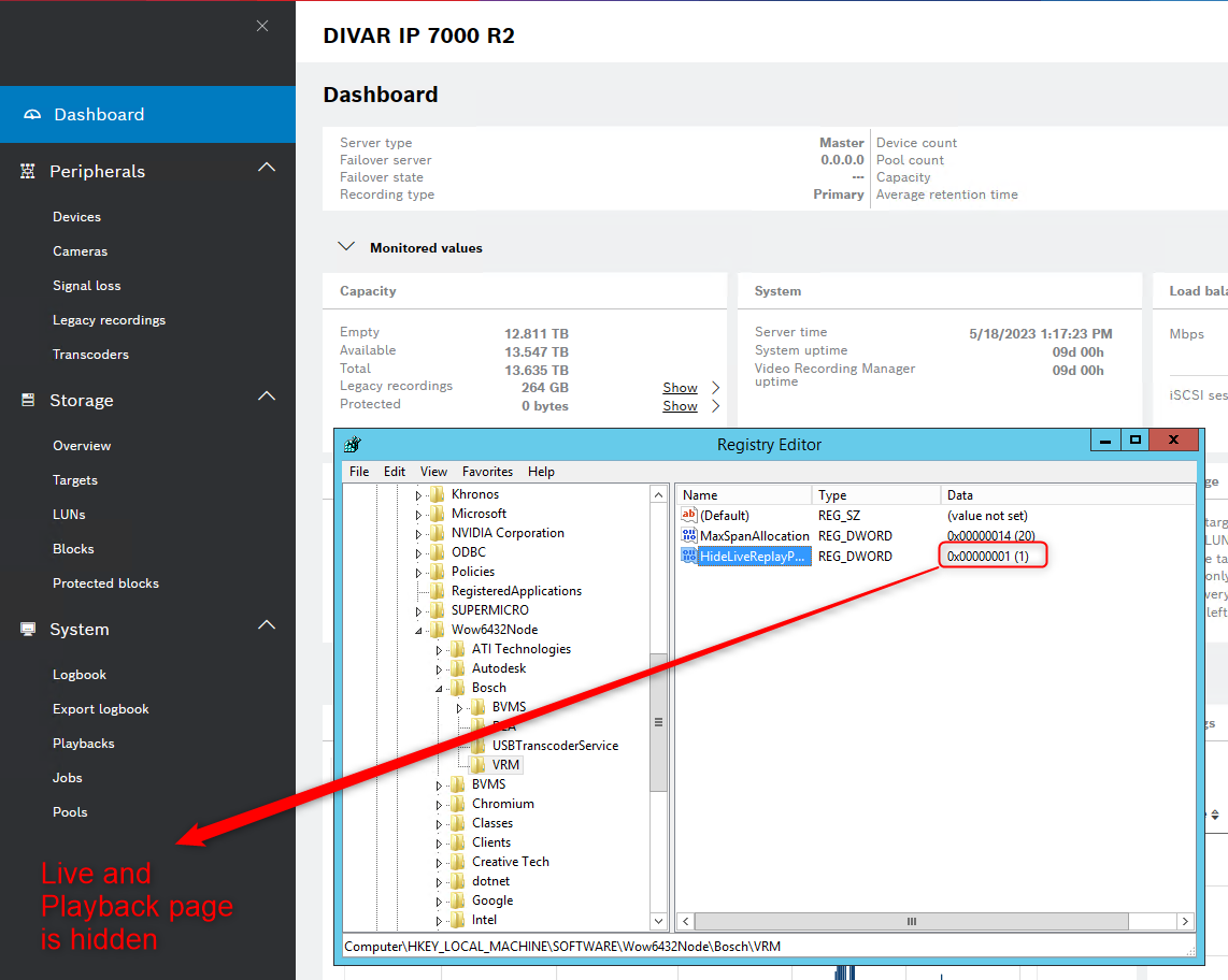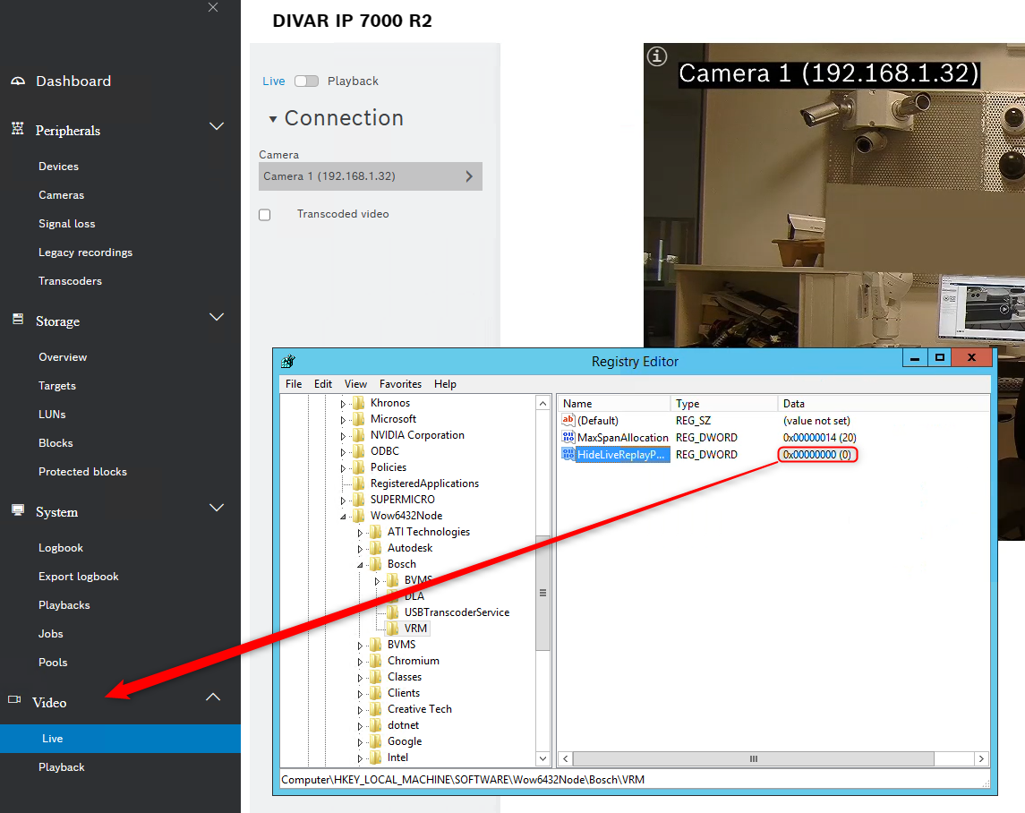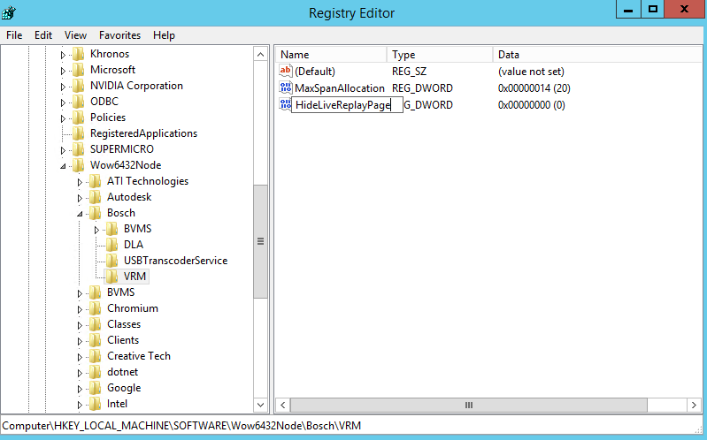 - If "HIDELIVEREPLAYPAGE=1" is specified, the property value '1' will be written to the registry key HKLM/SOFTWARE/WOW6432NODE/Bosch/VRM, HideLiveReplayPage (DWORD) as specified in the VRM setup